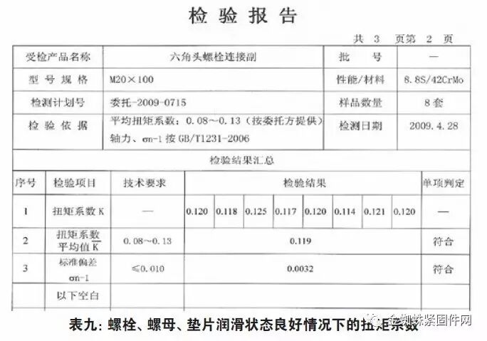 栓、螺母、垫片、重新认真涂抹,尤其是螺母内螺纹做到每牙都均匀地抹上Molykote1000润滑脂,紧固件研究所测定,扭矩系数大幅度下降,达到0.119,符合客户企业标准,具体见表九。