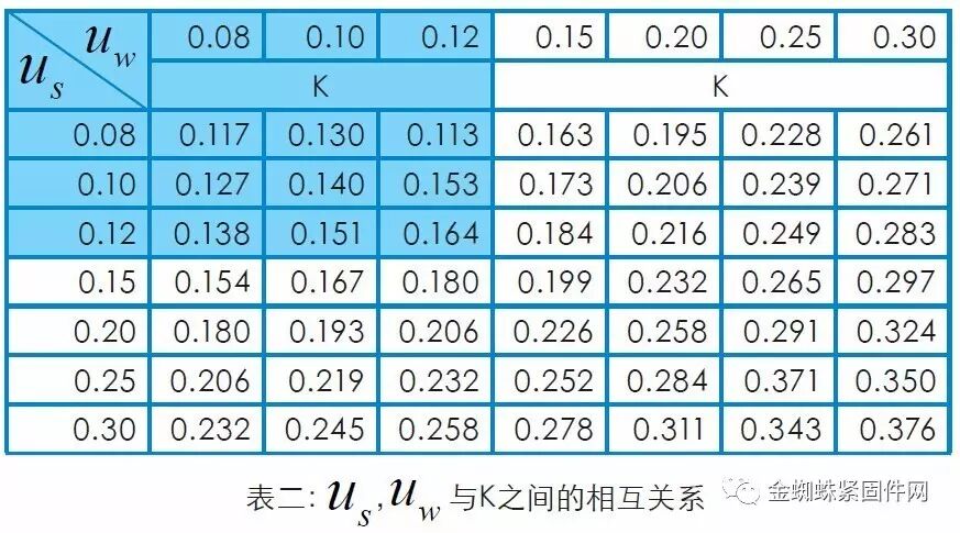 (2)扭矩系数与支承面摩擦系数、螺纹摩擦系数的关系不能用确切的数学公式来表示,但是他们之间的关系可以采用表格的形式来反映,表明了一定的对应关系(见下面表二):