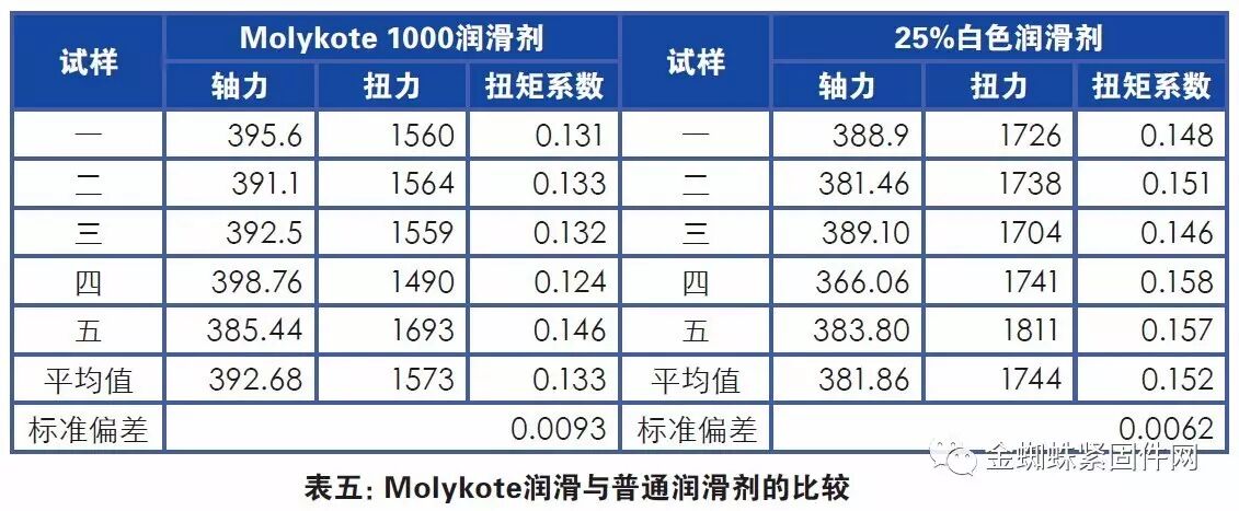 但是,用润滑剂后,扭矩系数直线下降;而且不同类型的润滑剂,扭矩系数下降的幅度不同。我们采用两种不同的润滑剂进行螺纹表面润滑:一种是Molykote 1000的油脂性润滑剂;另外一种润滑剂是上海达克罗公司25%的白色油性润滑剂,分别用了五套连接副做试验,情况见表五。