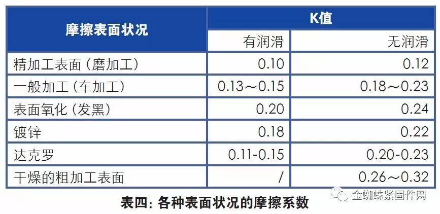 润滑后扭矩系数、摩擦系数下降幅度一般在20%~50%左右,有些比较好的润滑方式,扭矩系数K可以下降80%甚至100%以上,我们对高强度紧固件连接副各种表面状态进行了一系列的试验,得出各种表面状况对扭矩系数K的影响状况,具体见表四。